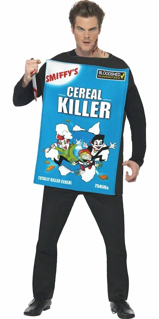 Our Adult Cereal Killer Costume includes Blue Tabard with ‘Cereal Killer’ Print.Â