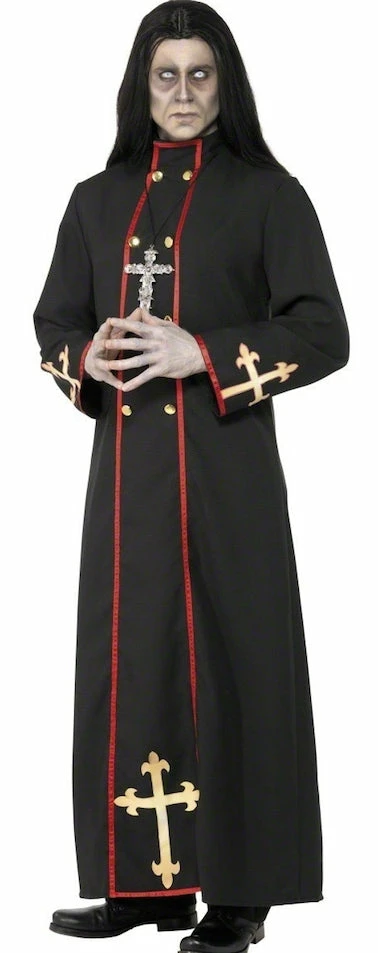 The costume includes comes a long black robe with gold cross design and red trim. Â