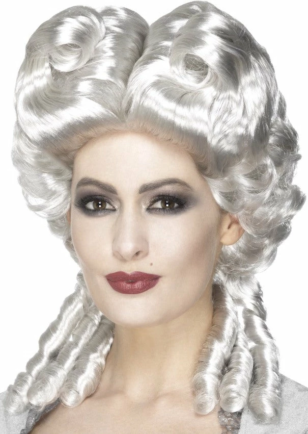The White wig has curls and an ornate design.