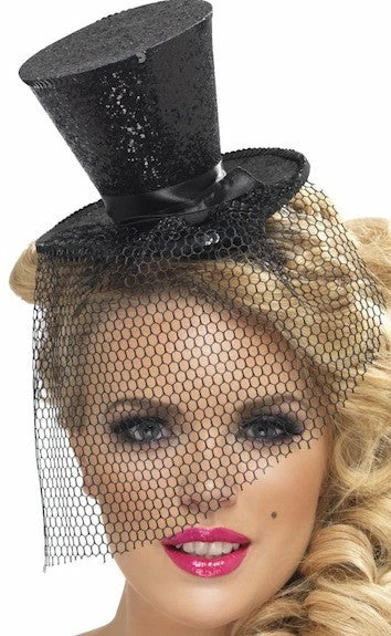 Our Mini Black Top Hat on a Headband with Detachable Netting will add the finishing touch to many Burlesque or Halloween Costumes.