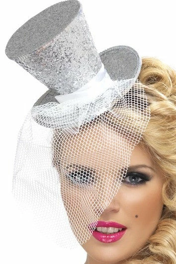 Our Mini Silver Top Hat on a Headband with Detachable Netting will add the finishing touch to many Burlesque and Halloween Costumes.