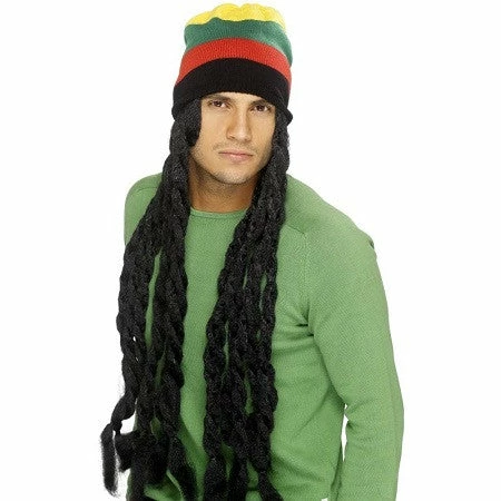 Our Rasta Hat in traditional colours of red, yellow, green and black have long dreadlocks attached.