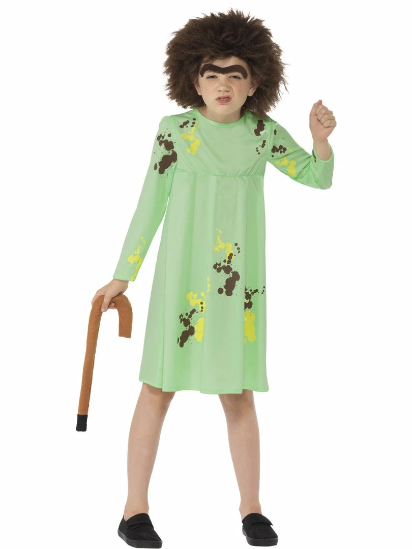 Our Mrs Twit costume includes a long sleeved green dress with yellow and brown paint splatters. and a soft brown walking stick.