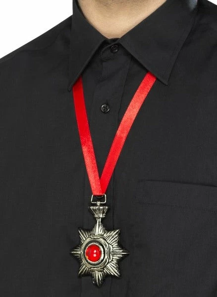 Our Vampire Metal Medallion will complement your Vampire Costume this Halloween This Vampire Necklace features a Star Shaped Silver Medallion with a Red Jewel in the Centre attached to a Red Ribbon Chain.