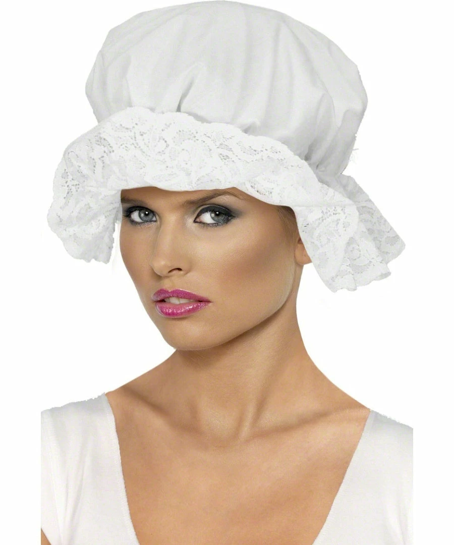 Transform into this Victorian maid with this White mop cap with lace.