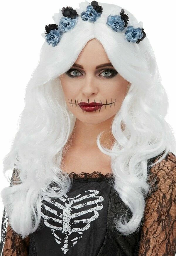 Our White, Day of the Dead Wig is perfect to complete any Halloween Costume, complete with small flowers.