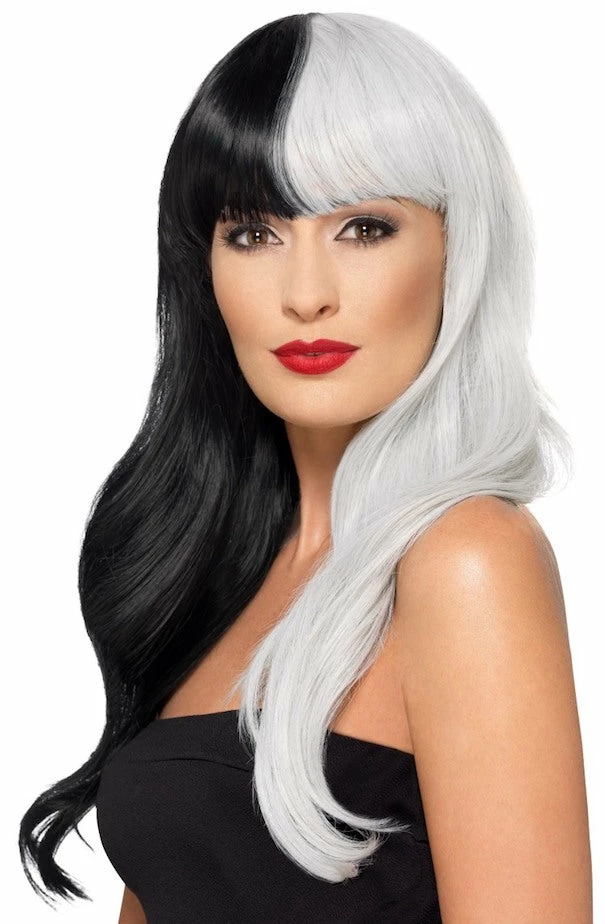Our Deluxe, Black and Grey, Evil Lady Fringed Wig is perfect to complete any Vixen or Cruella De Vil halloween costume.