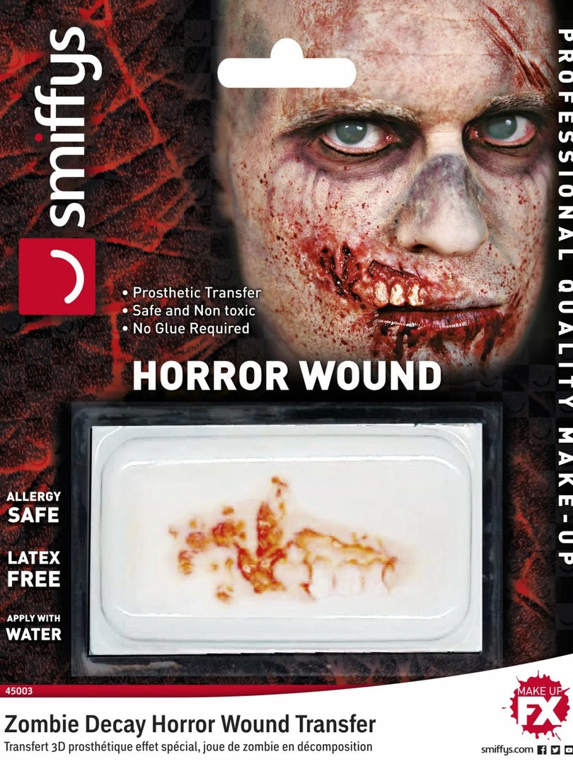 Finish off your Halloween costume with our Zombie Decay Wound Transfer.