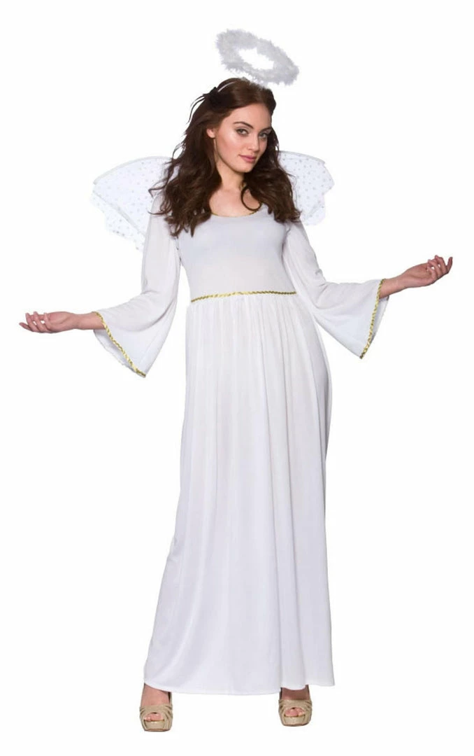 Our Angel costume includes a white dress with gold trim, halo and wings.