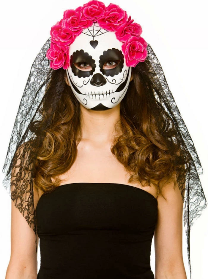 Our Day of the Dead, Mask and Veil with attached Flowers is perfect to complete many halloween costumes.