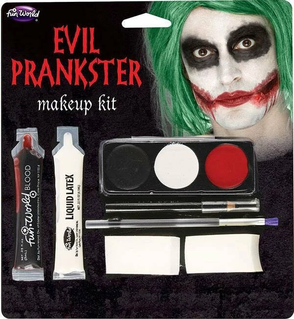 Our Evil Prankster Make Up Kit from Funworld includes 3 Colour Makeup Tray, Red, White and Black plus Blood, Liquid Latex, Make Up Pencil, 2 x Sponges and 1 x Brush