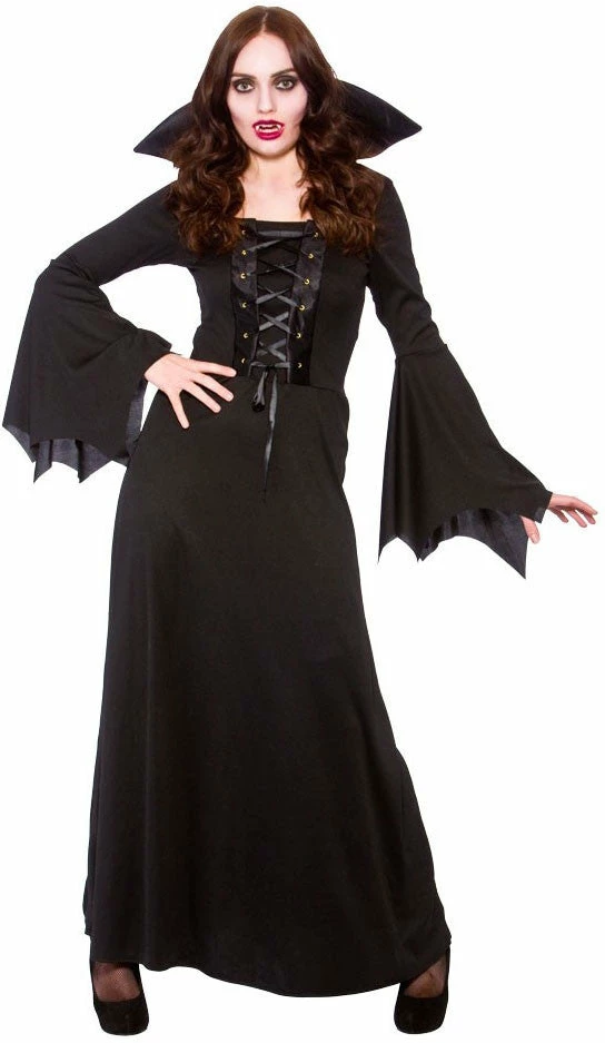 Our Dark Vampiress costume comes complete with dress and attached collar.