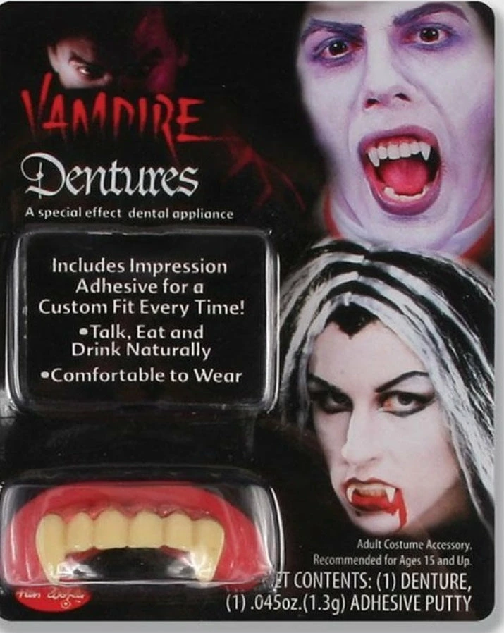 Our Vampire Dentures, with pointed Fangs will give your Halloween Vampire costume the complete look.