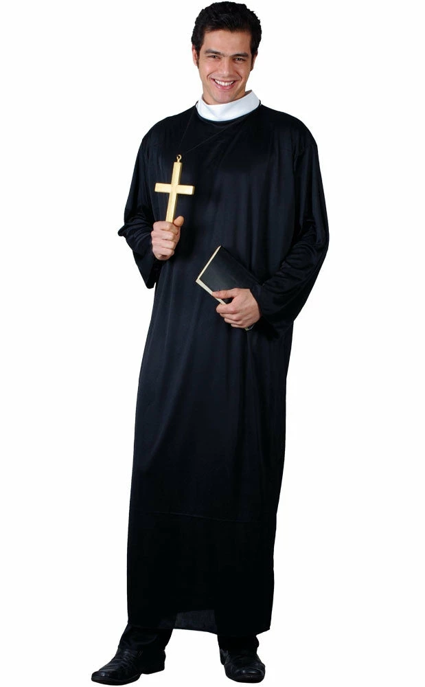 Our Father Father costume includes black robe with white collar & cross, perfect for Saints and Sinners parties’s
