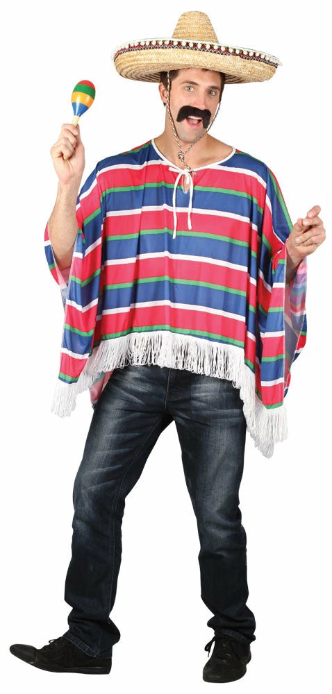 This colourful Mexican Poncho is perfect for any Mexican themed party. Complete with a sombrero, moustache and maracas.
