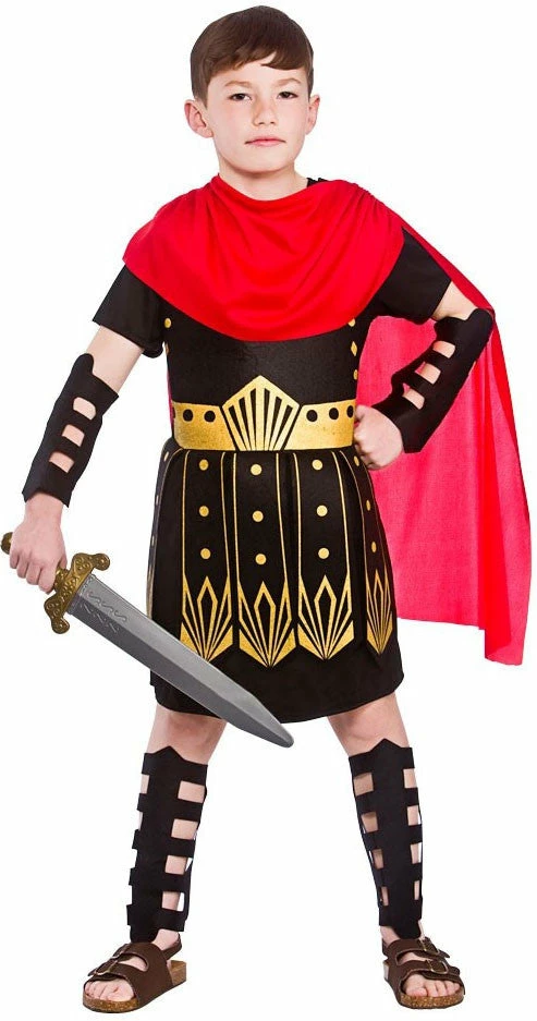 Costume includes tunic, armour, cape, arm and leg guards.